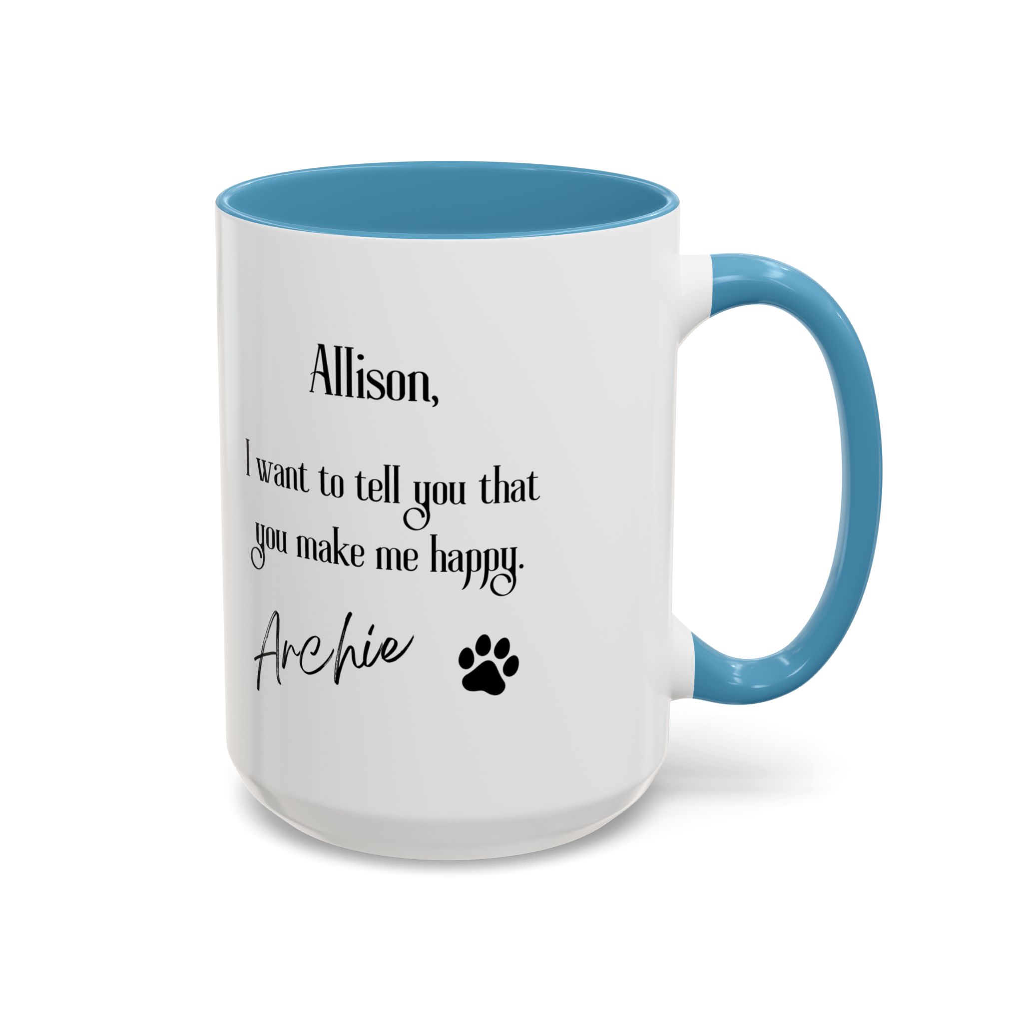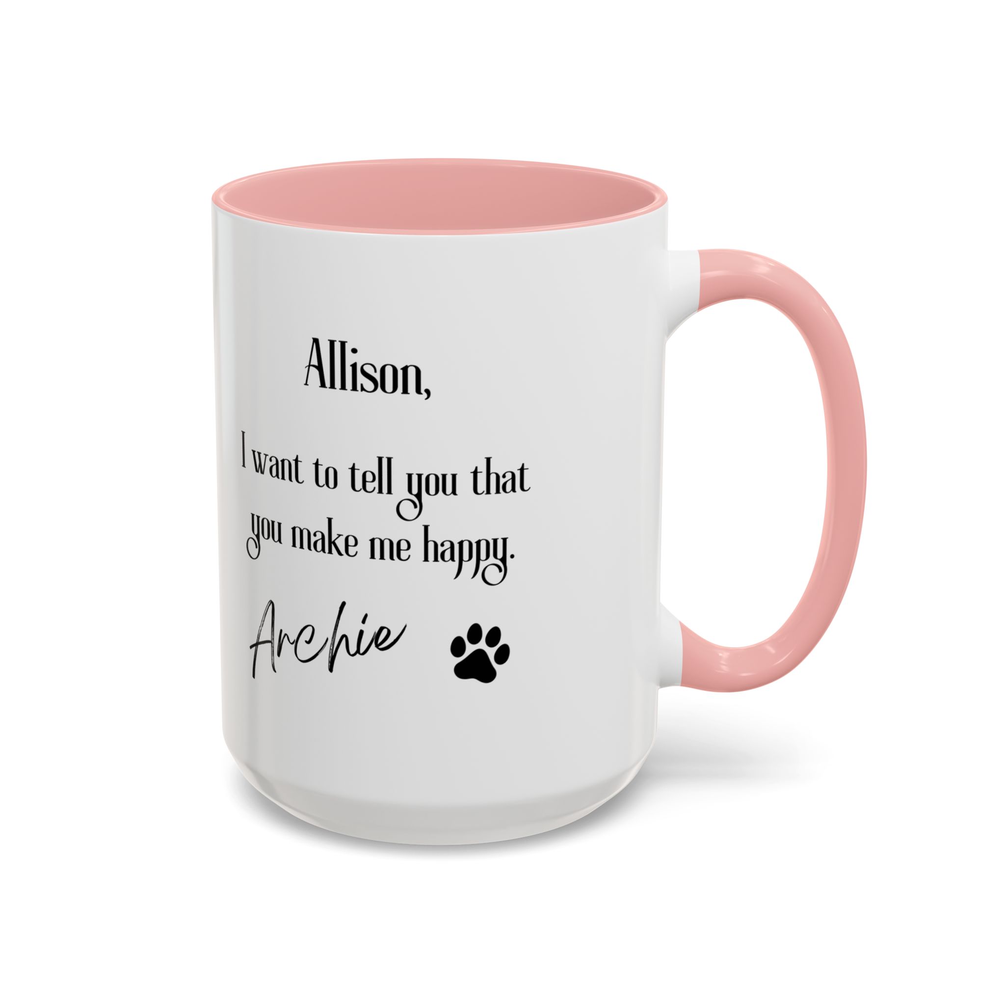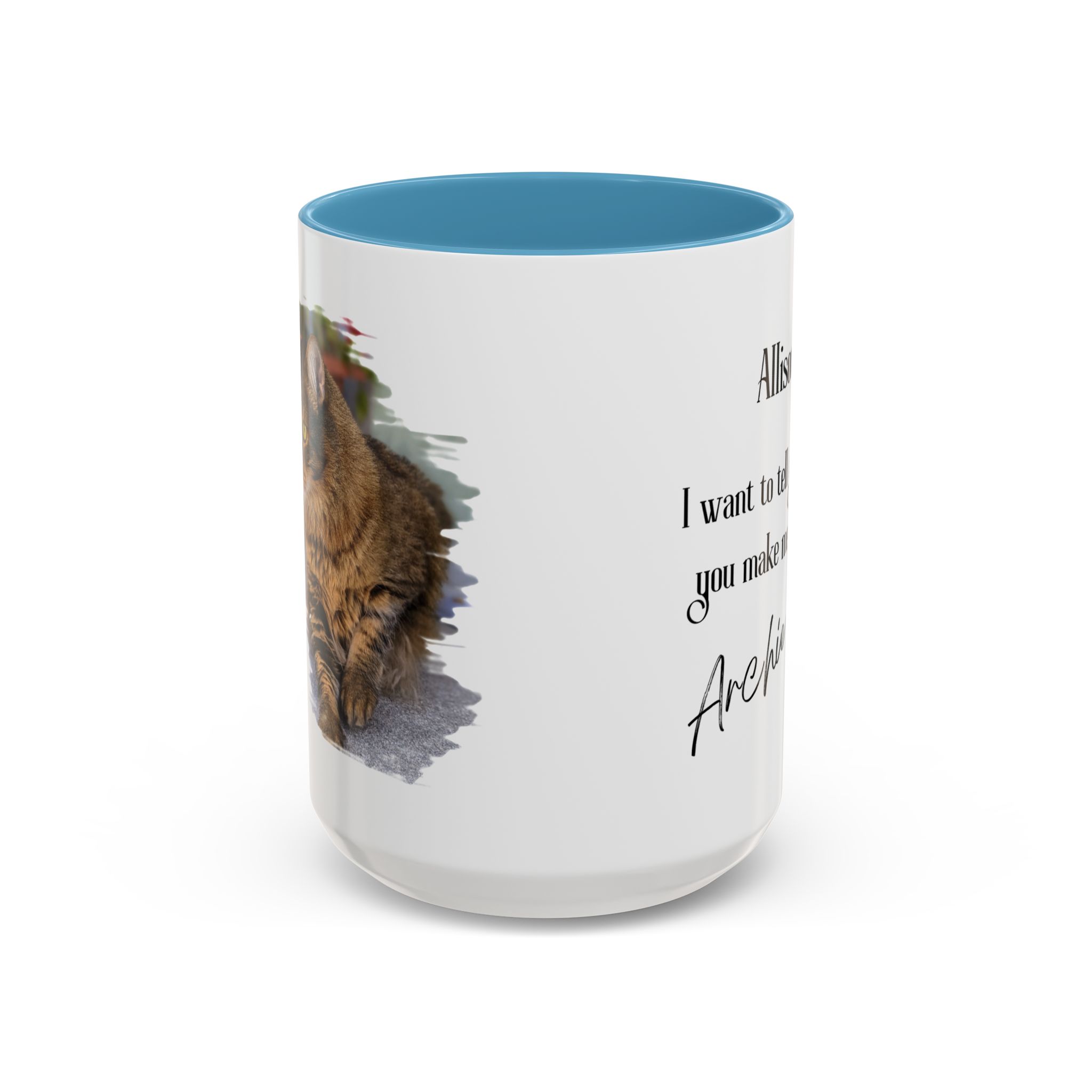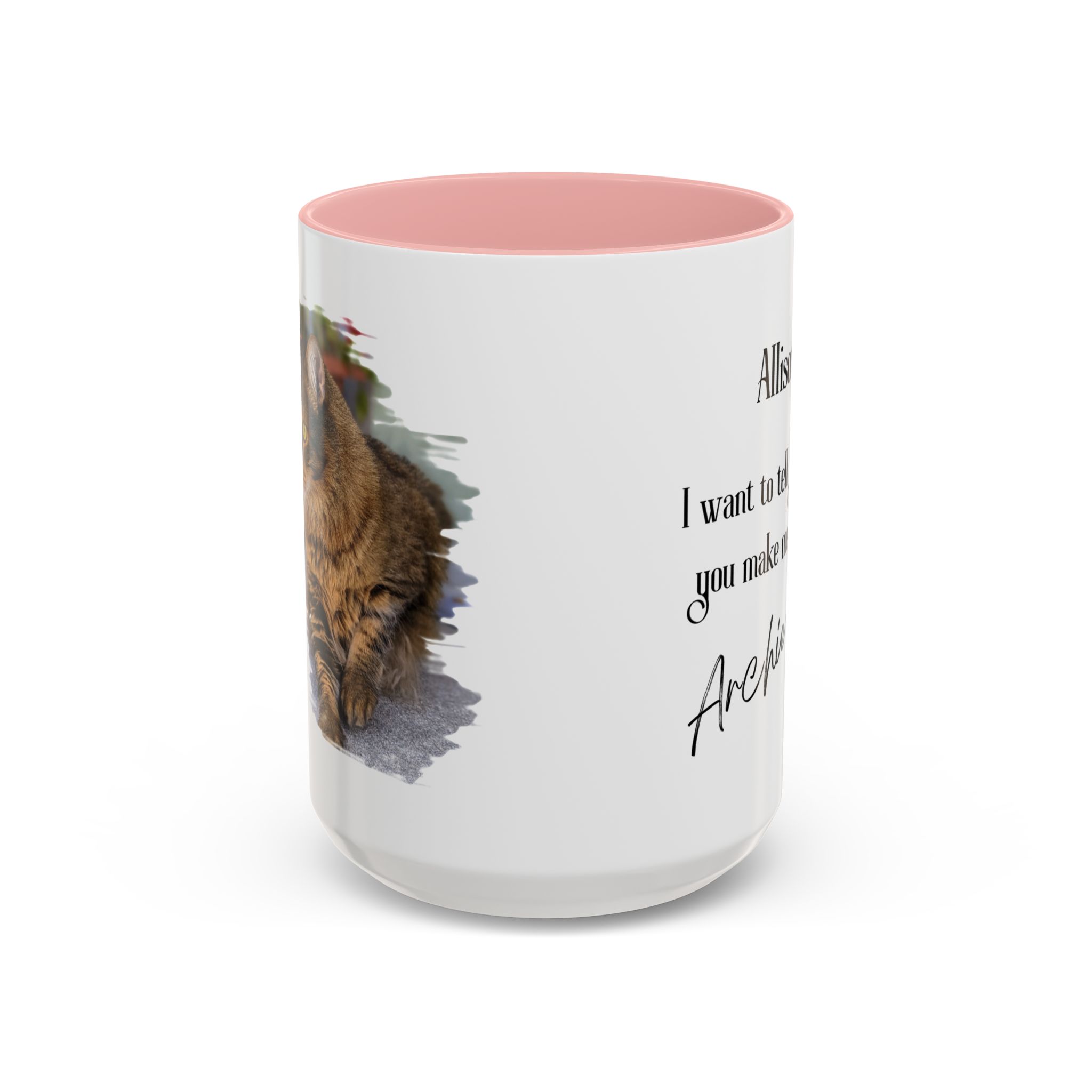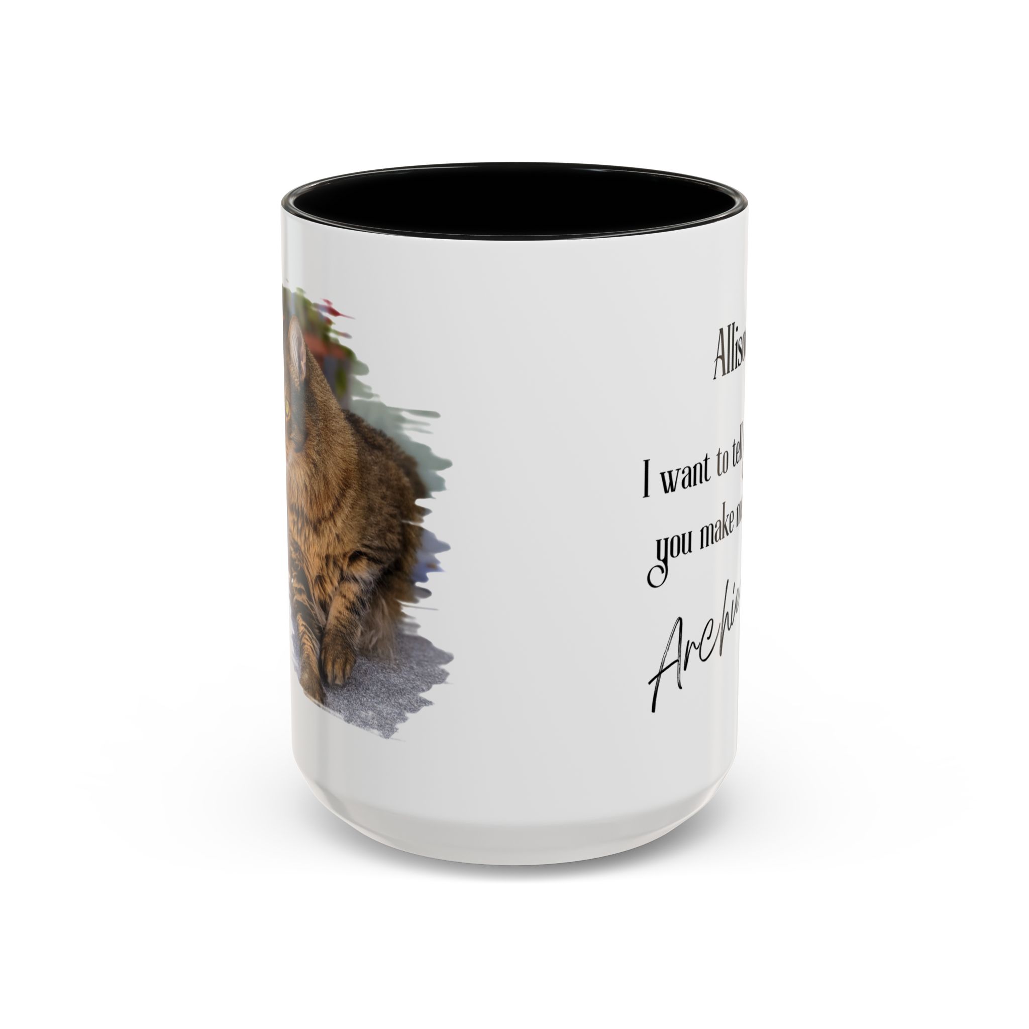 What makes this mug truly special is its customizable brush-style design that includes your name, your cat’s name, and a photo of your beloved pet. The mug also features an inspirational message that reads: «I want to tell you that you make me happy,» creating the heartwarming illusion that your cat is sending you this loving message through the mug. This thoughtful detail makes it not only a functional piece but also a daily source of joy and inspiration.